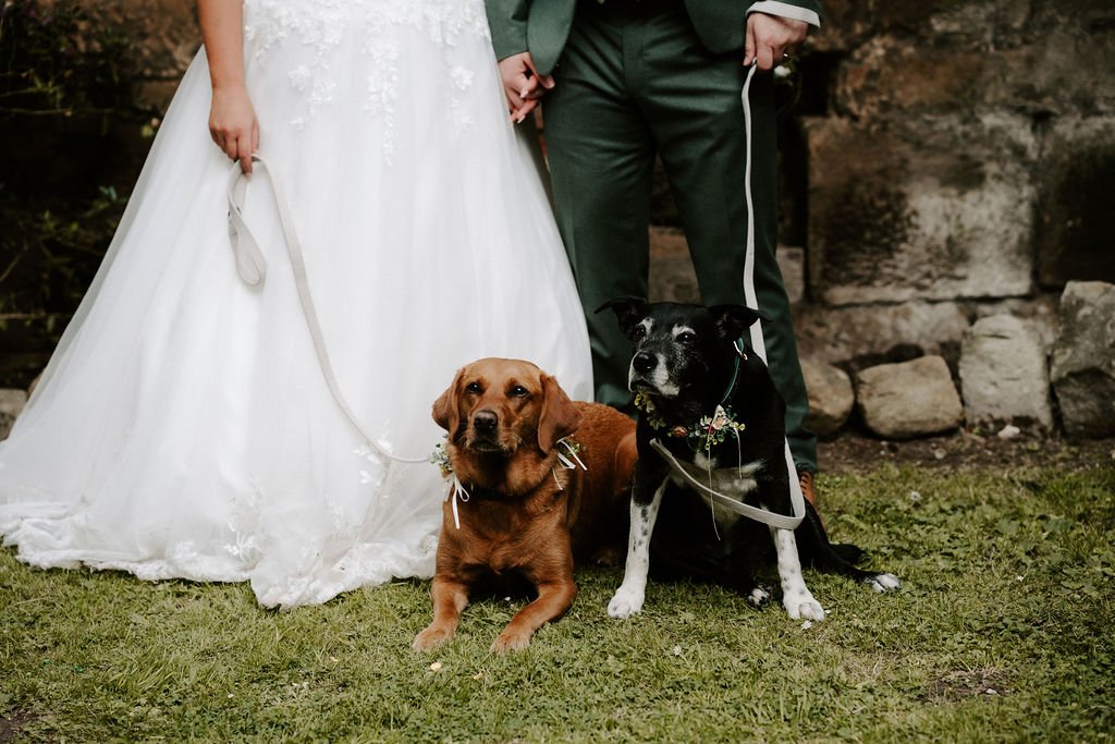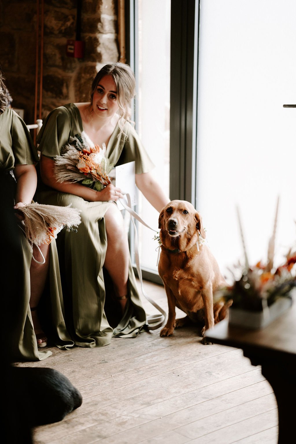 When the ceremony started, Bella and Maisie joined Lydia and her bridal party for their walk down the aisle. I stood slightly off to the side, making sure they felt safe and supported while remaining unobtrusive. The dogs settled beautifully, watching the ceremony and staying calm throughout.
